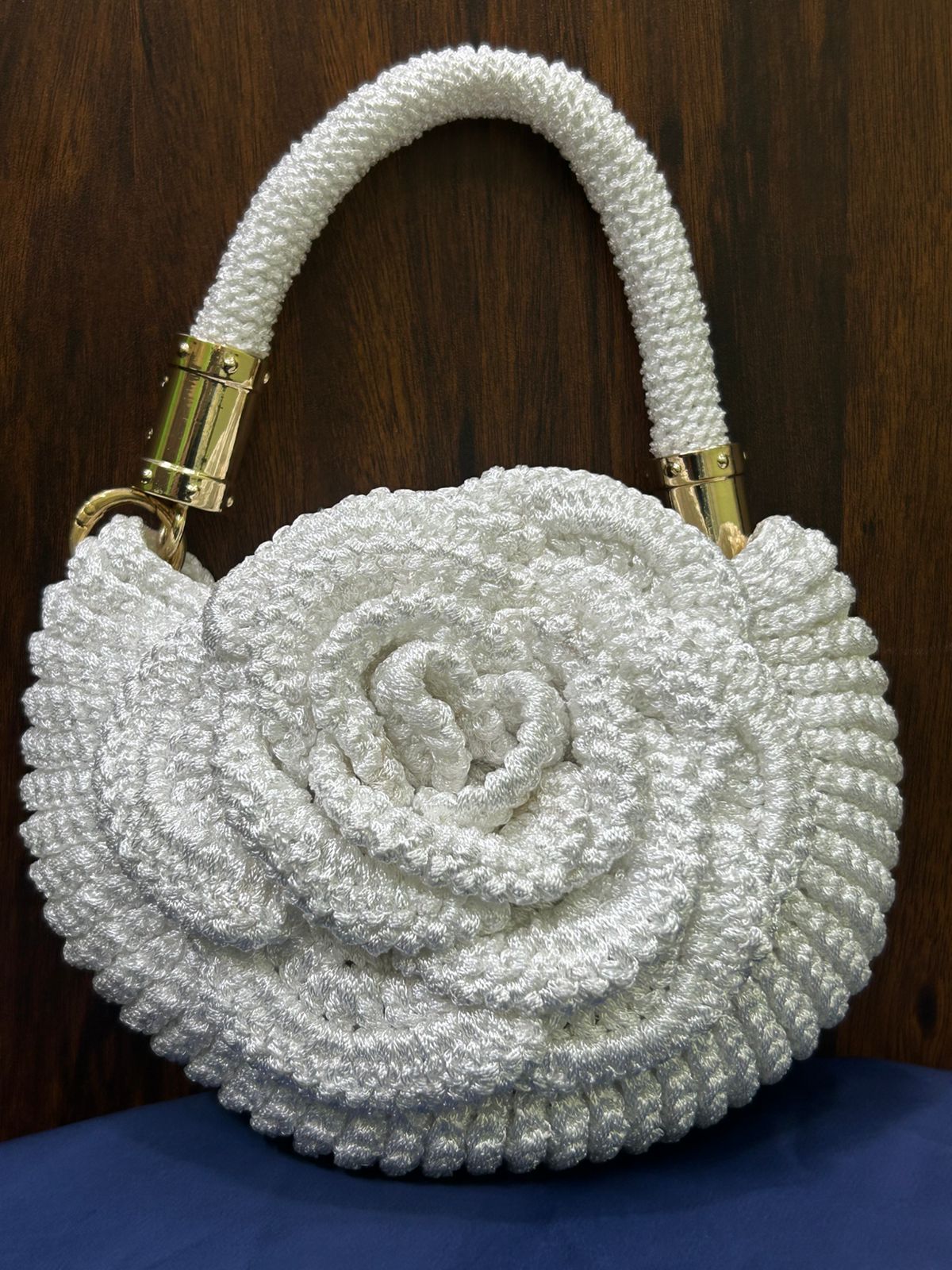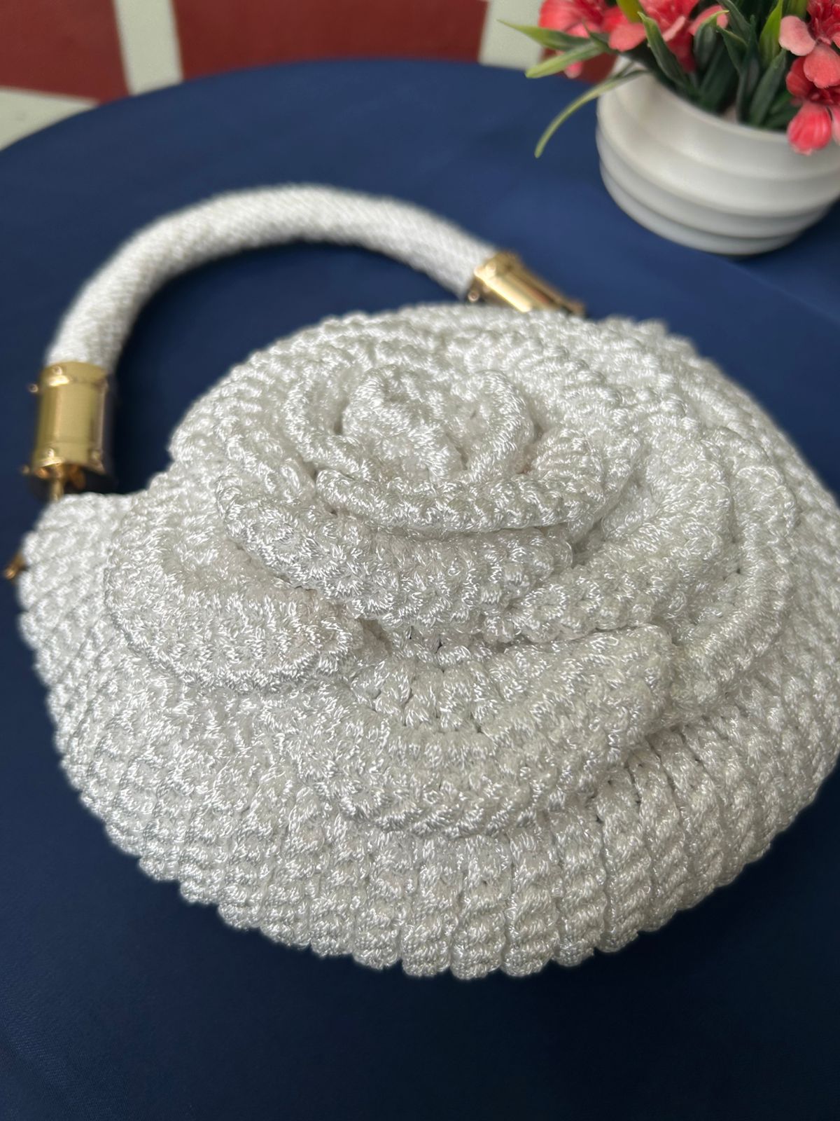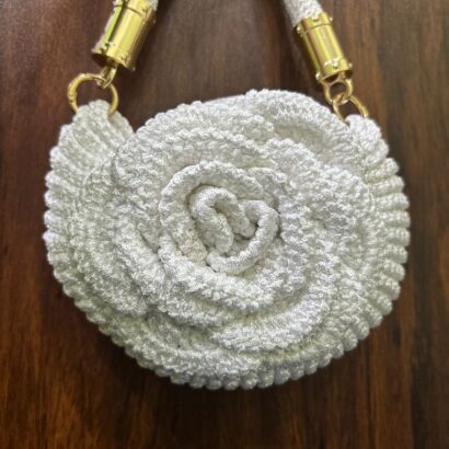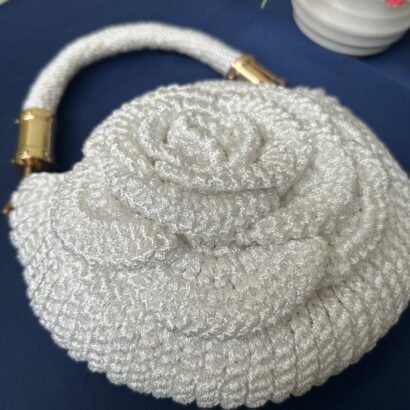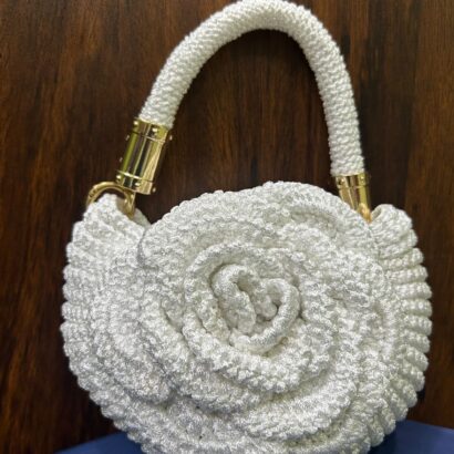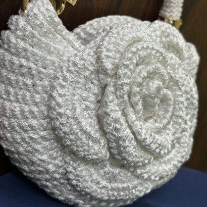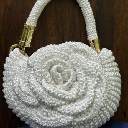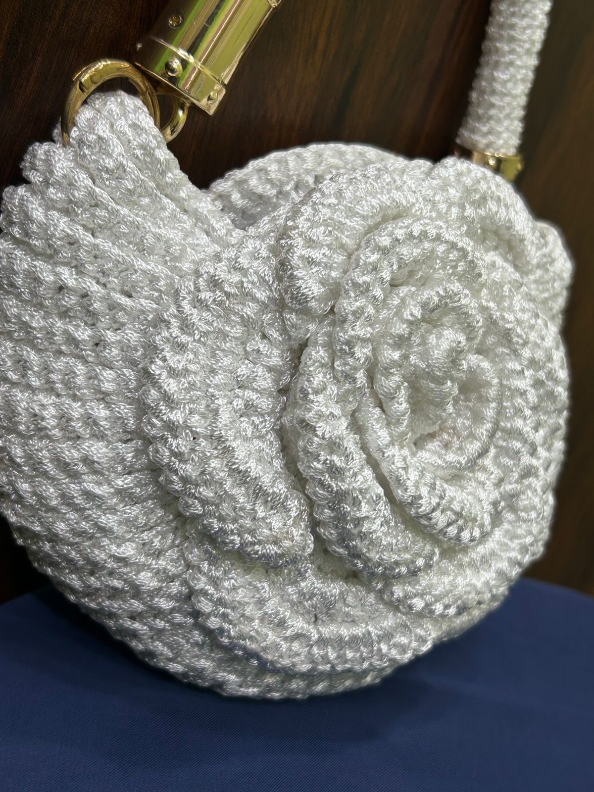 Step out in style with this unique, handmade crochet clutch. Meticulously crafted with high-quality white yarn, this bag features a stunning, three-dimensional rose design that adds a touch of romantic elegance to any outfit. The intricate texture and soft feel of the crochet work make it a true piece of wearable art.