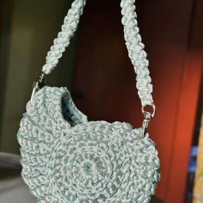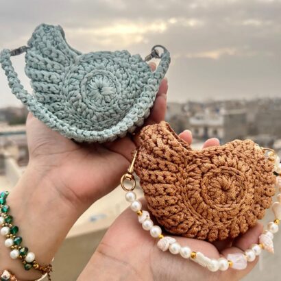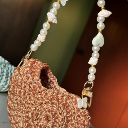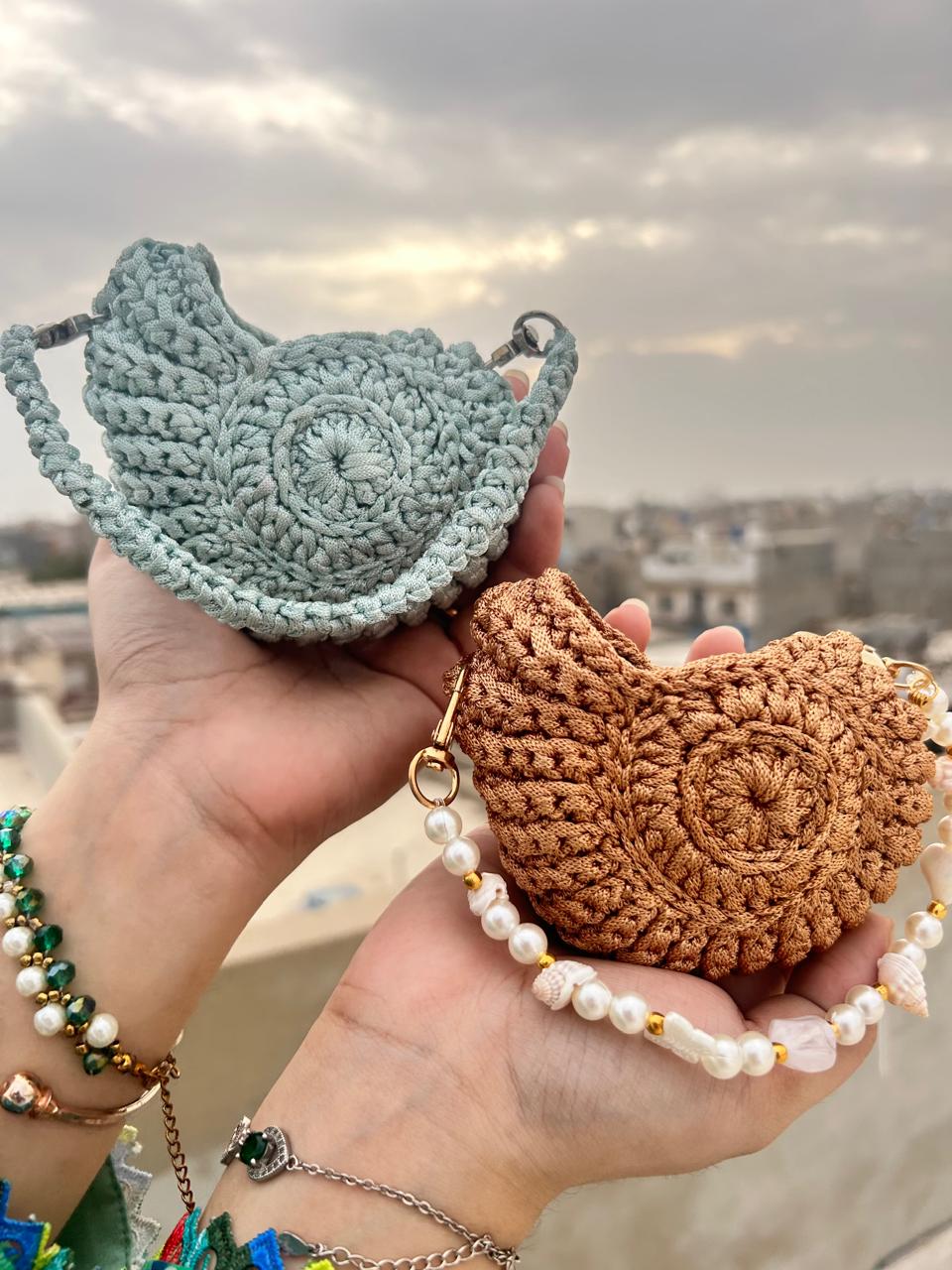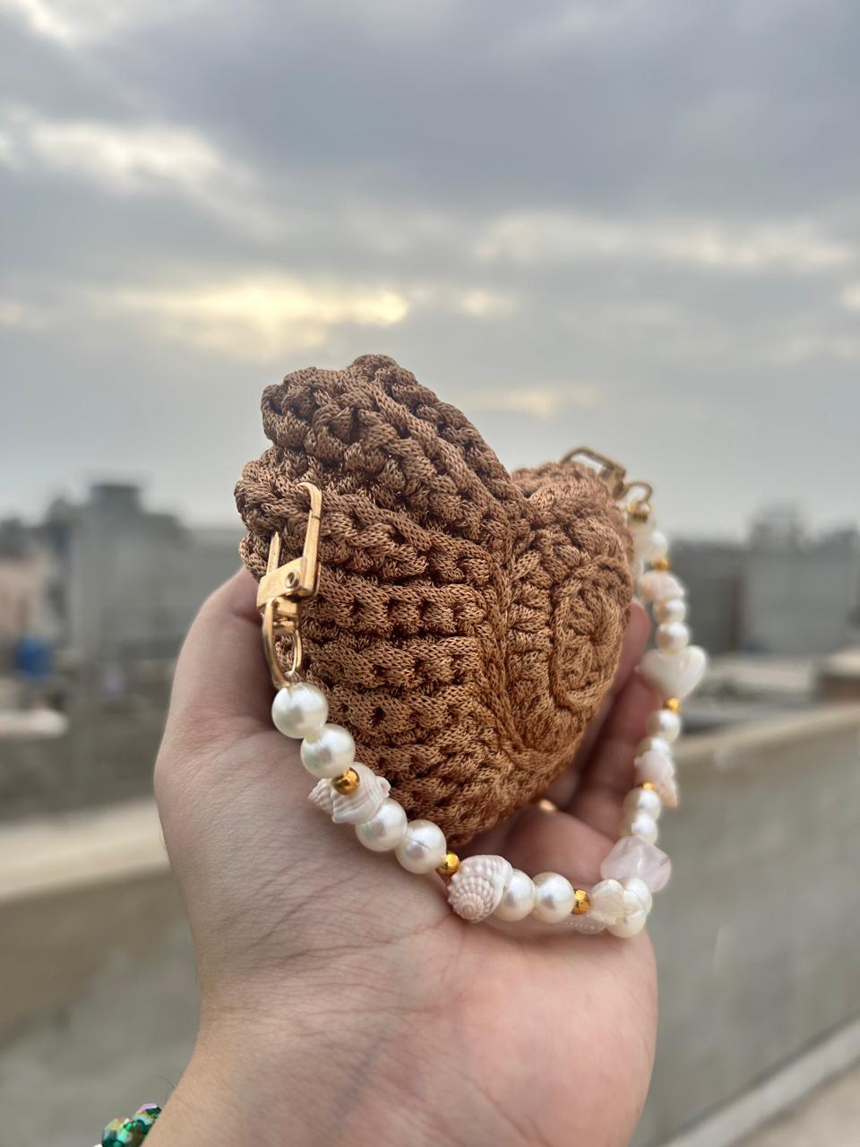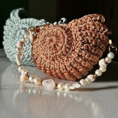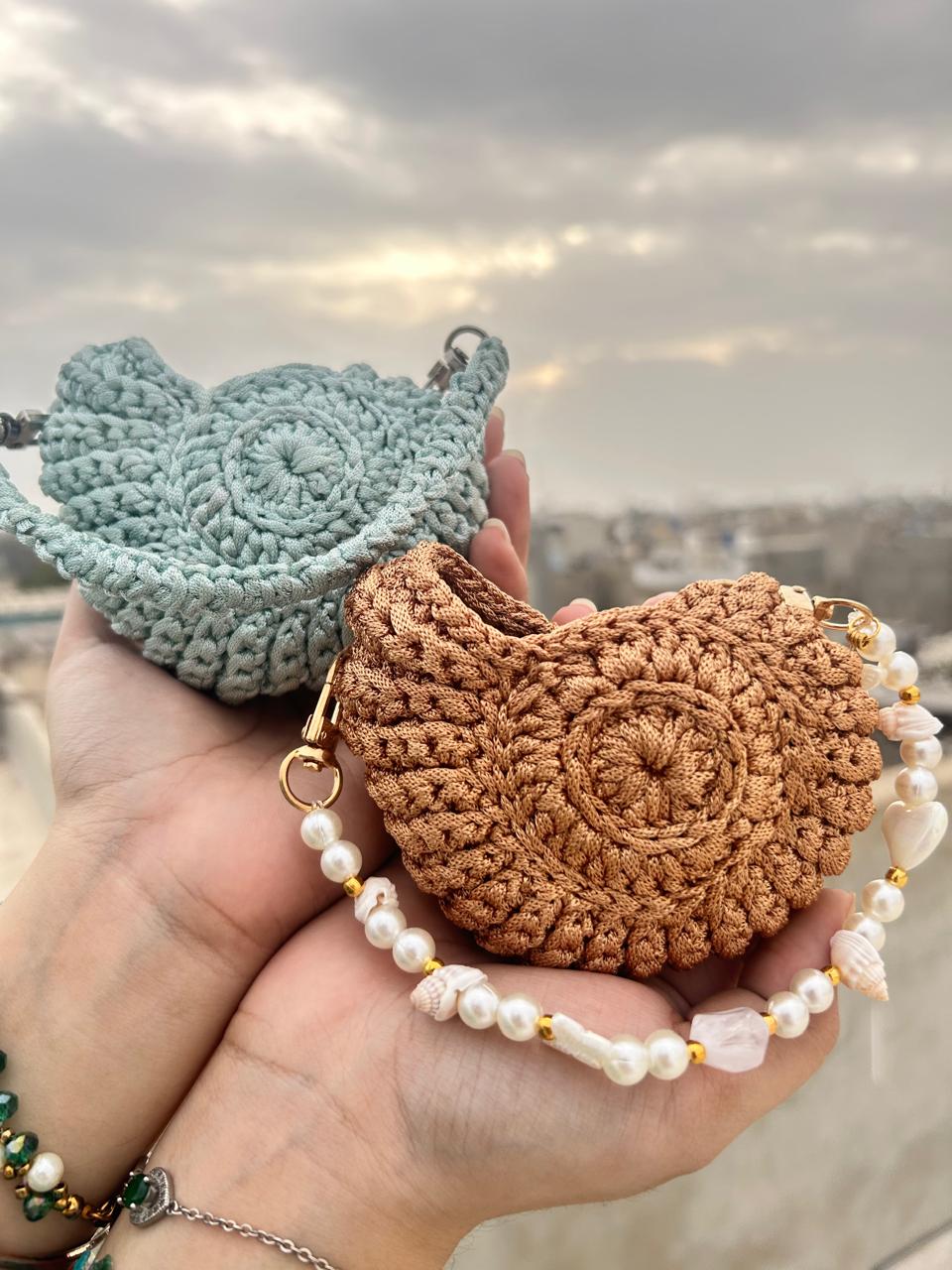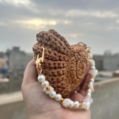 This beautiful mini pouch is lovingly handmade with rich brown crochet yarn, designed in a round textured pattern that feels soft and premium. The strap features real sea shells ๐, natural pearls ๐ค, and gold accents โจ, giving it a unique beach-inspired charm. Perfect for carrying small treasures, coins, or jewelry โ a stylish companion for sunny days or evening outings.