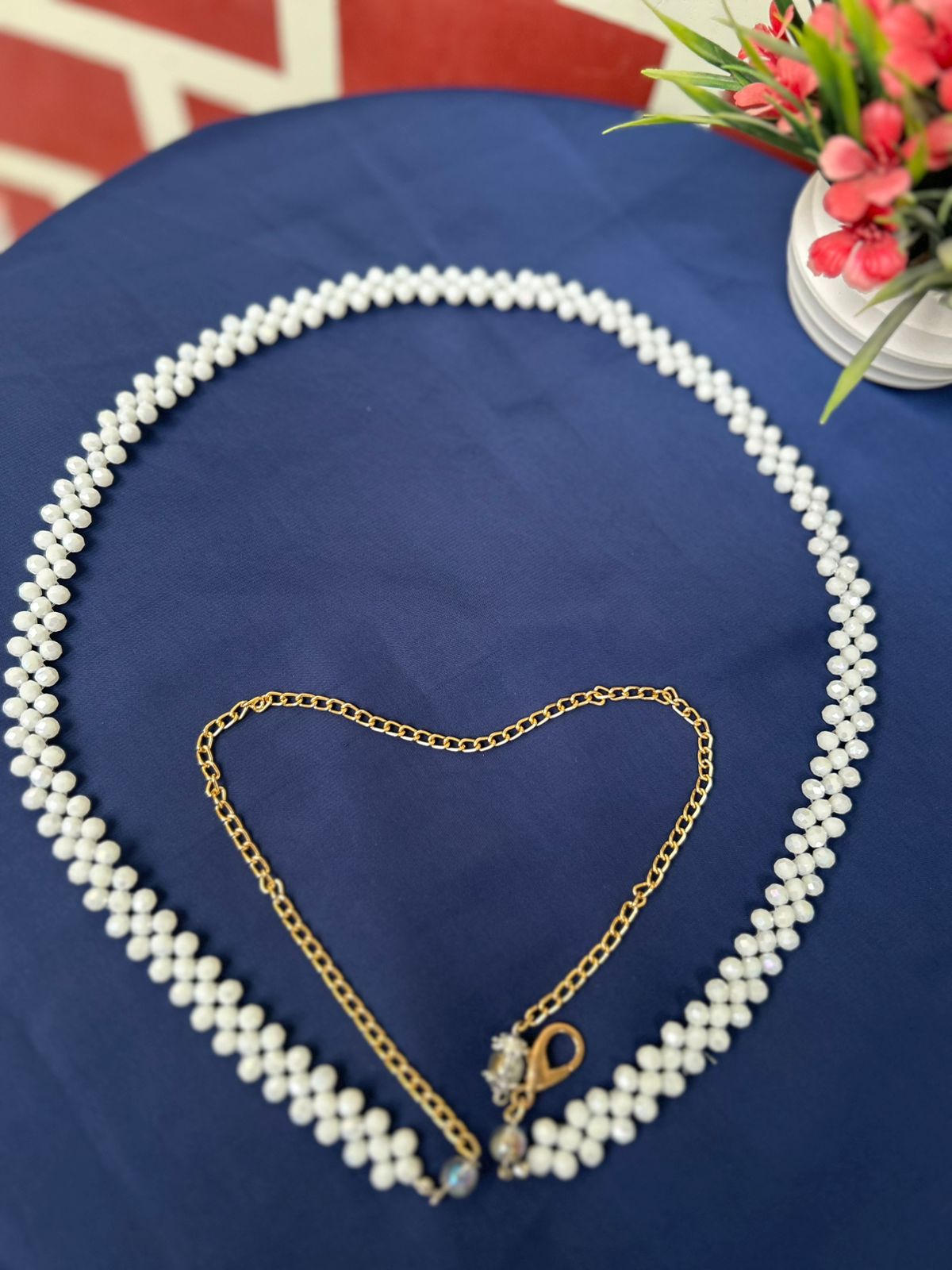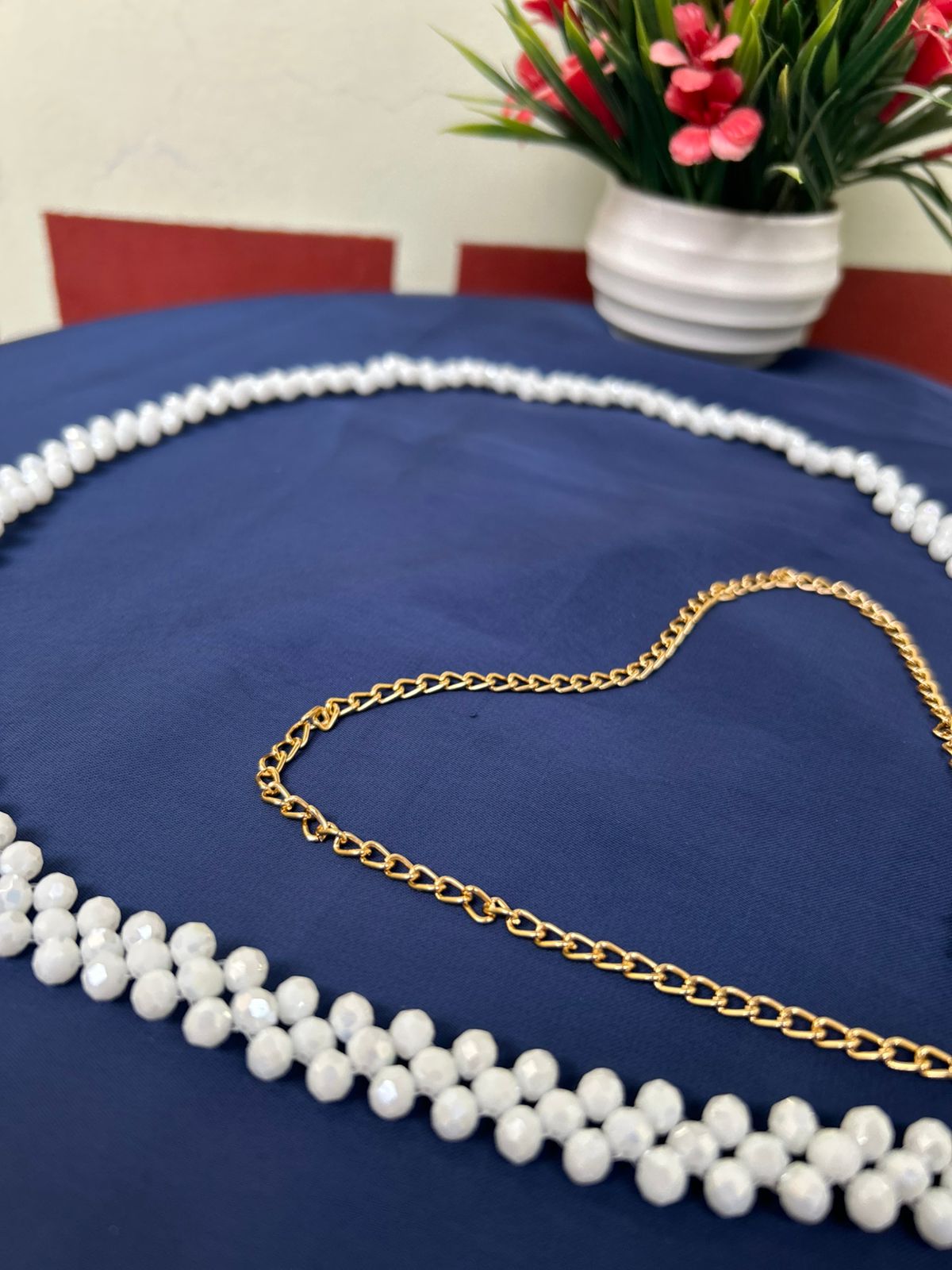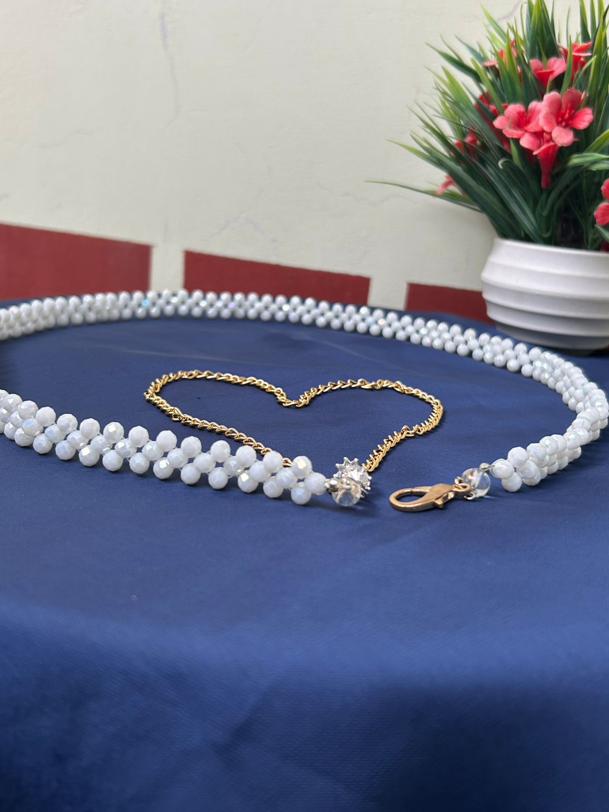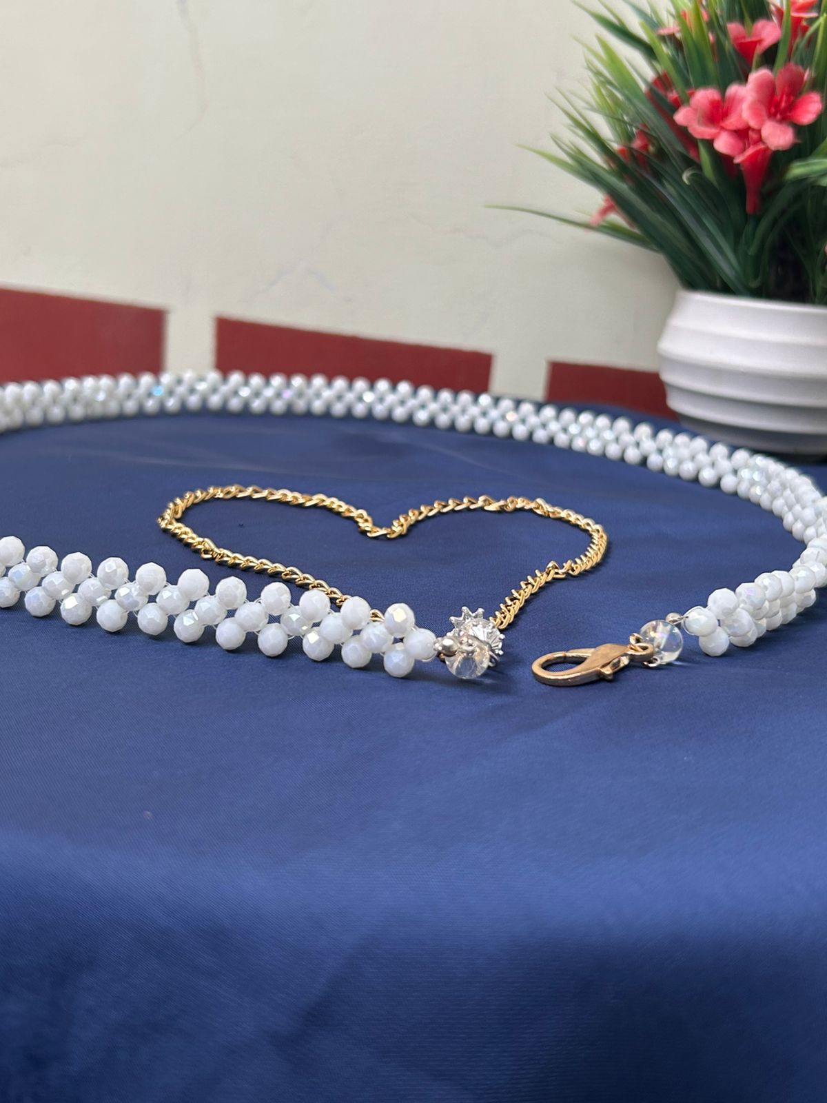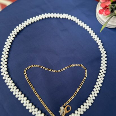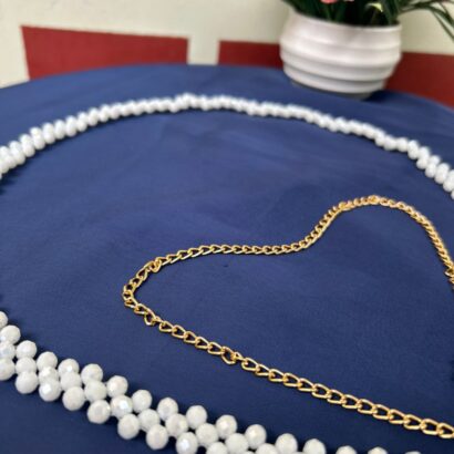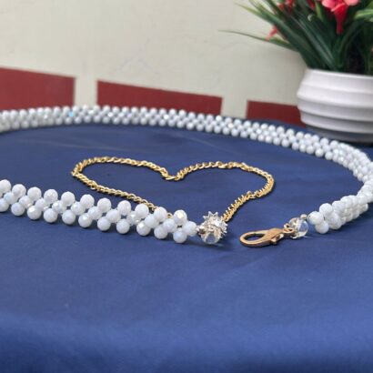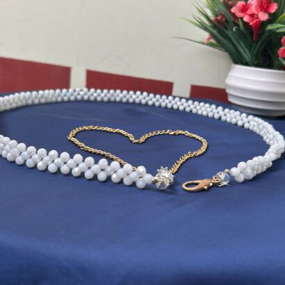 - SEO Keywords: White Moti Kamarbandh, Crystal Pearl Waist Chain, Adjustable Saree Belt, Bridal Hip Chain, Ethnic Fashion Accessory, Designer Kamar Patti.