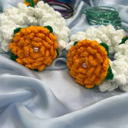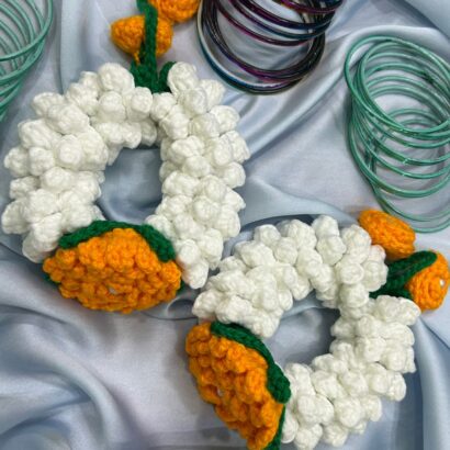 - SEO Keywords: Crochet Gajra, Handmade Wool Hair Accessory, Permanent Floral Veni, Marigold Flower Hair Bun Clip, Traditional Indian Hair Jewellery, Reusable Motiya Gajra, Festive Hair Decoration.