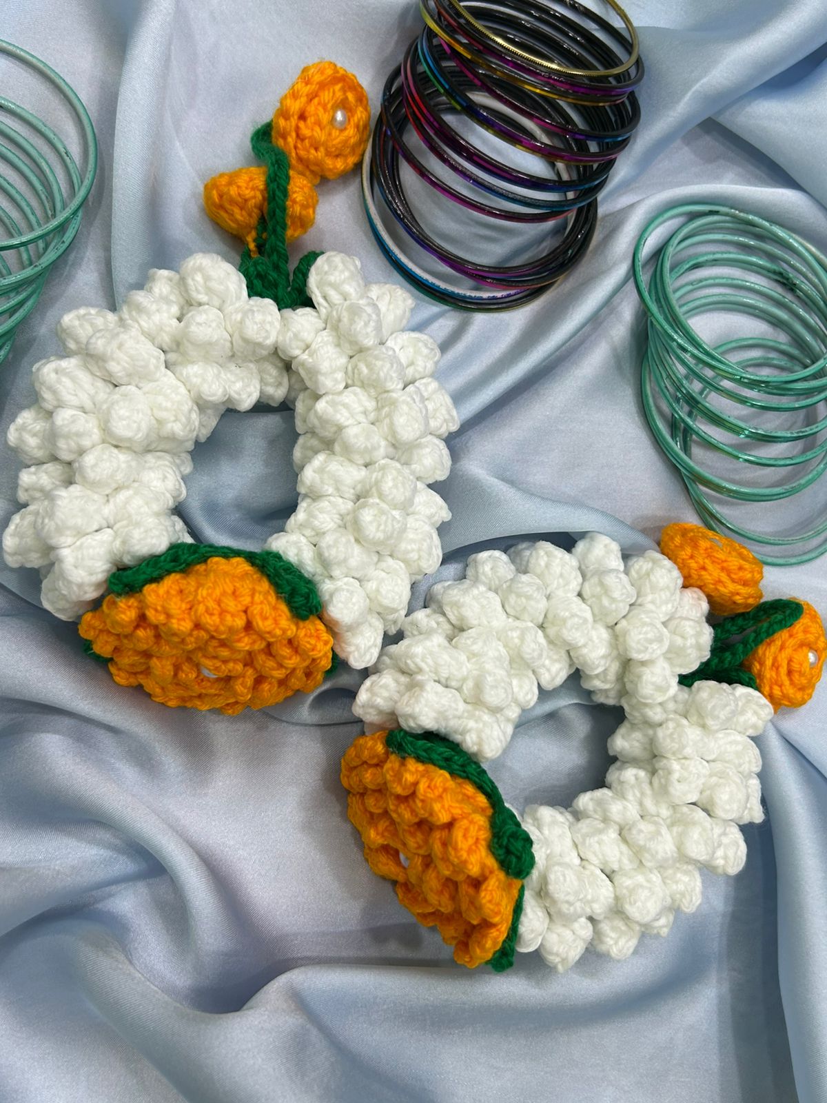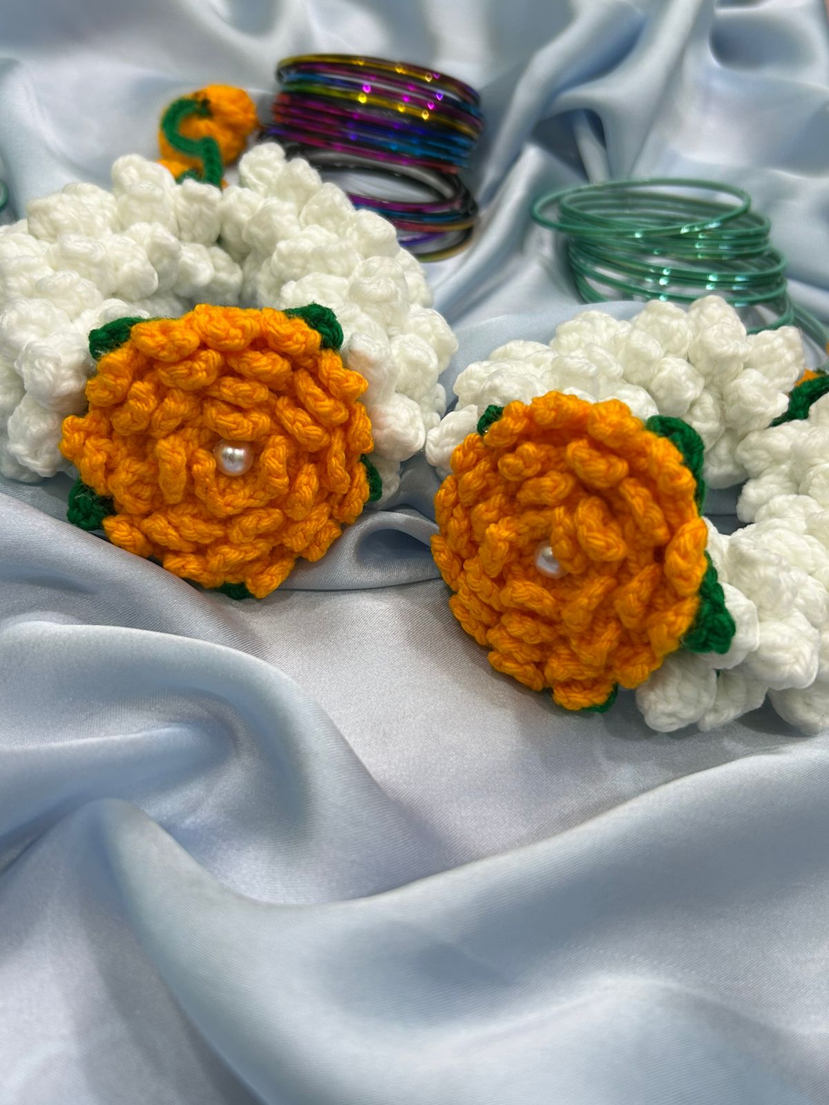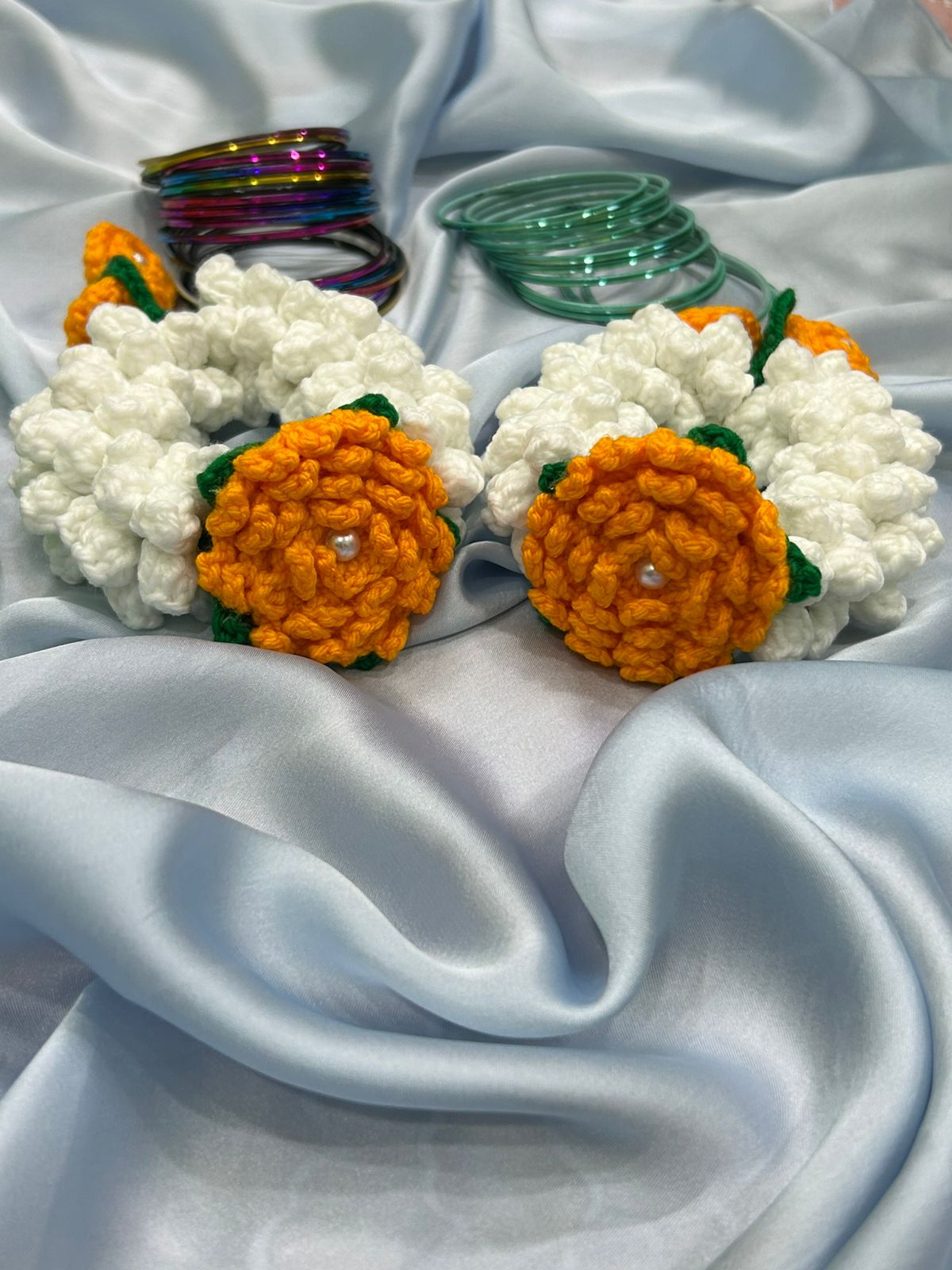 Beautiful Handmade Crochet Gajra Set! π§‘πΌ Reusable wool flowers with white Motiya and orange Marigold style details. The perfect permanent hair accessory for weddings, festivals, and all ethnic looks. SEO-friendly and unique! Grab this elegant pair now. π