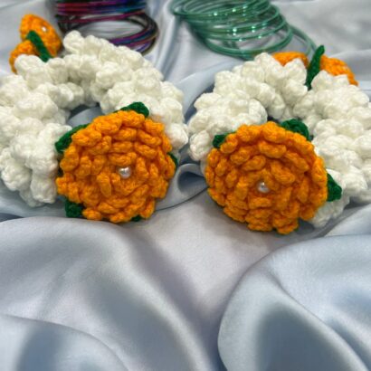 Introducing a stunning pair of handcrafted crochet floral gajras that bring the traditional beauty of fresh flowers without the worry of wilting! Made from high-quality, soft wool/yarn, these gajras feature delicate, fluffy white ‘Motiya’ (Jasmine) style flowers beautifully contrasted with vibrant orange ‘Marigold’ (Genda) style blooms, each accented with a pearl.