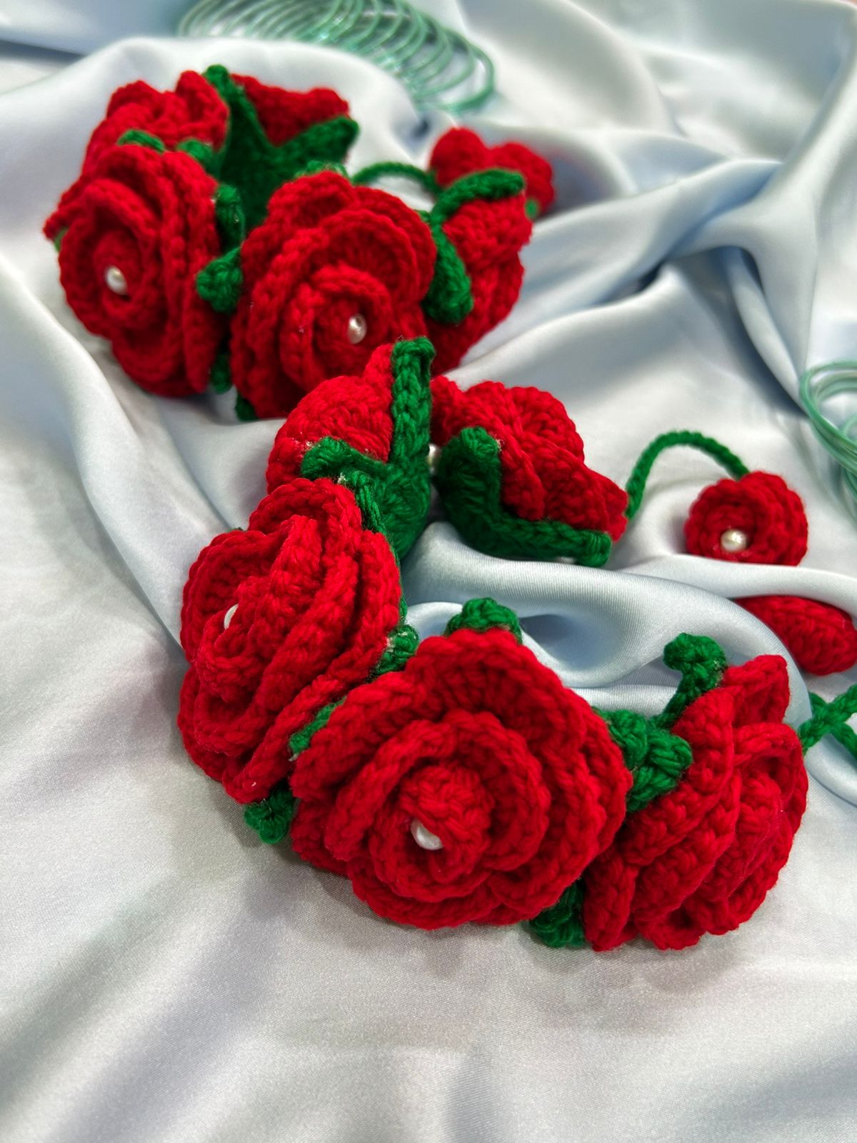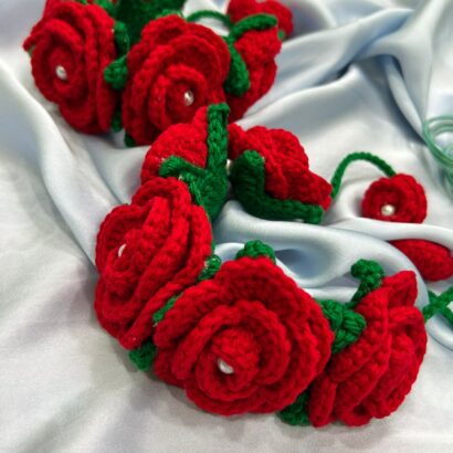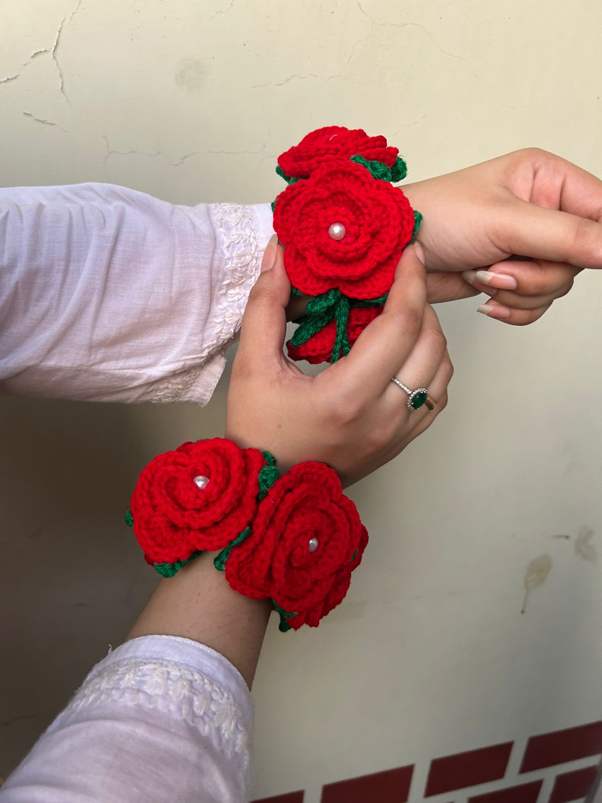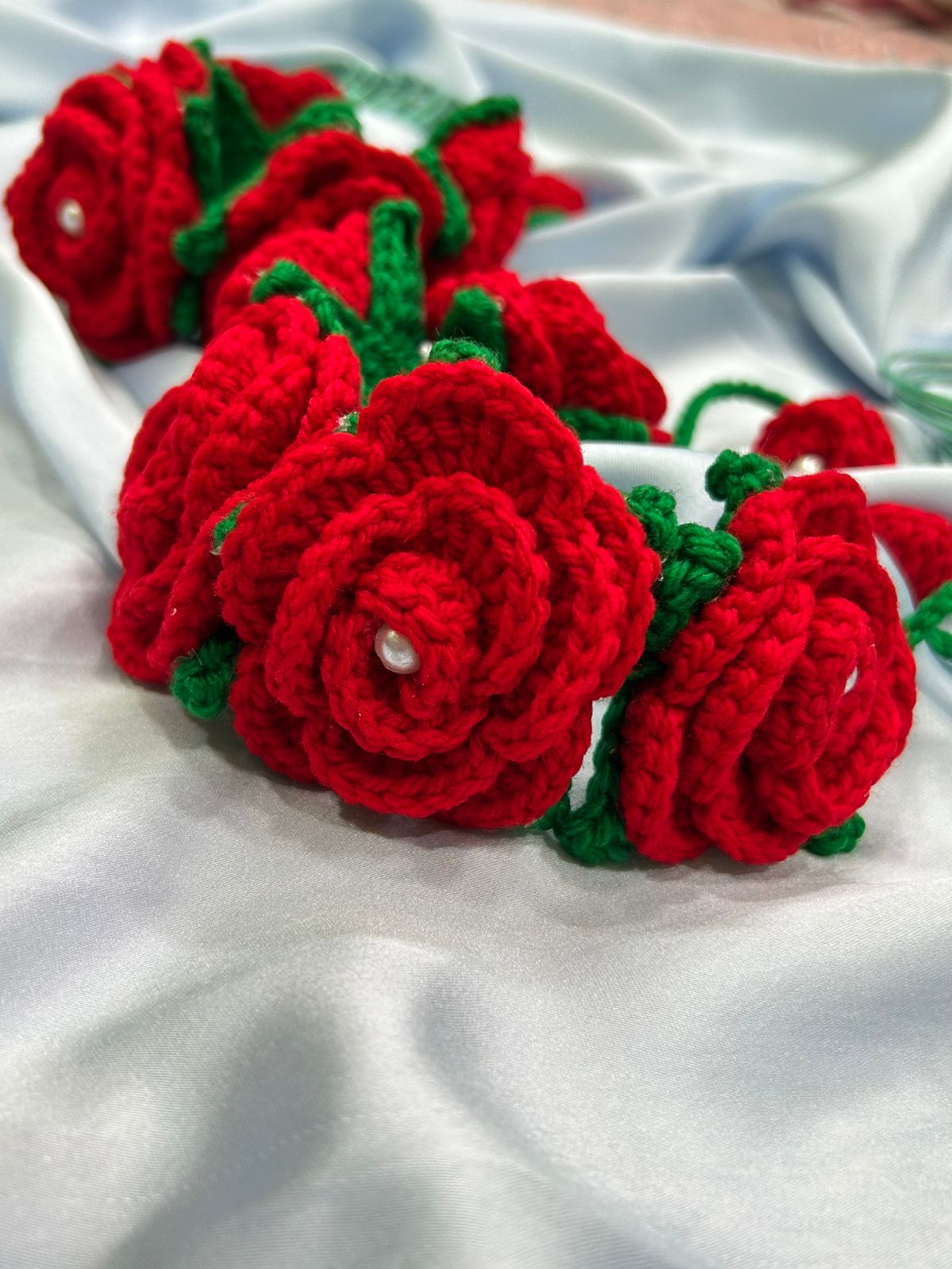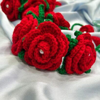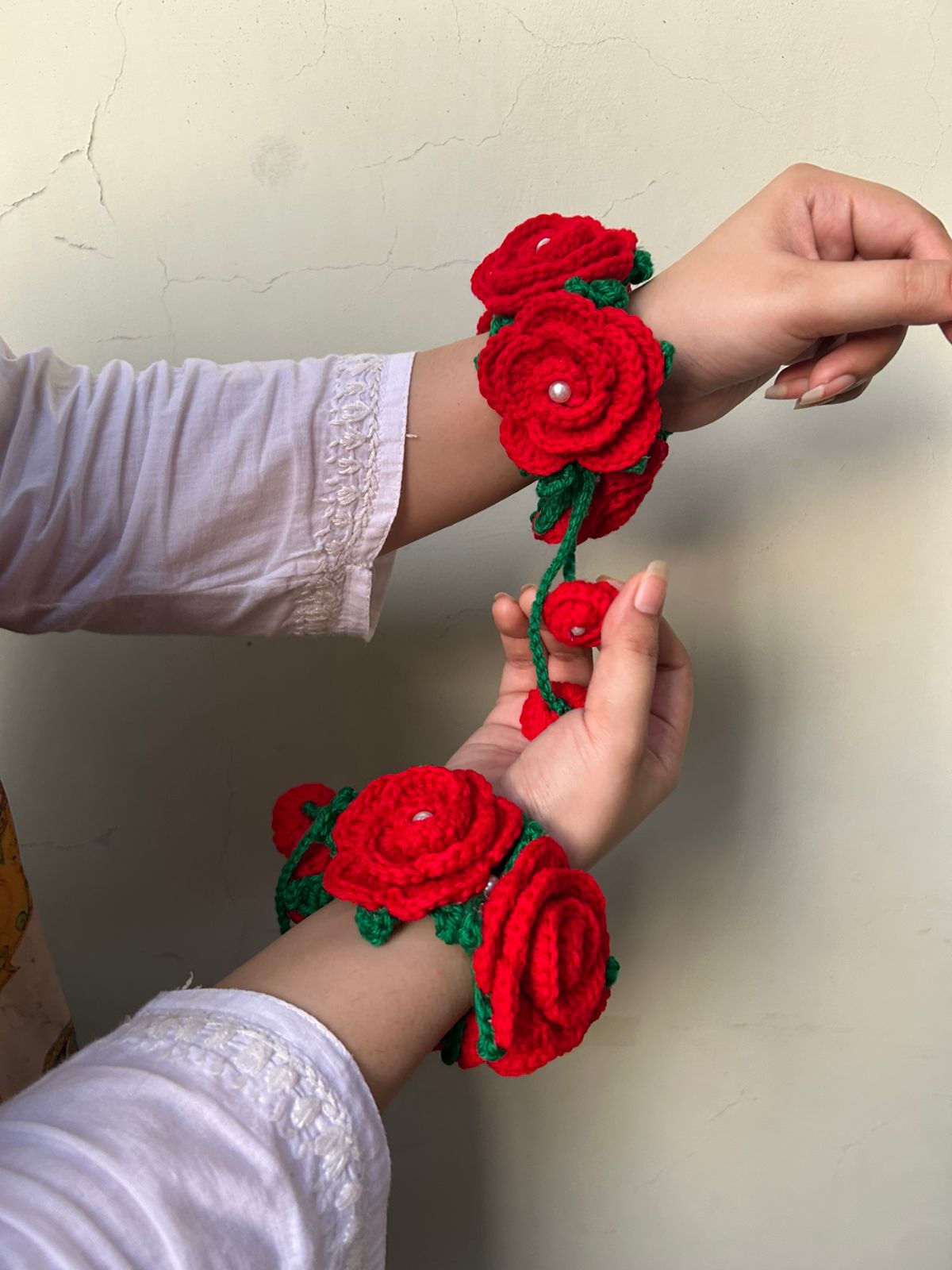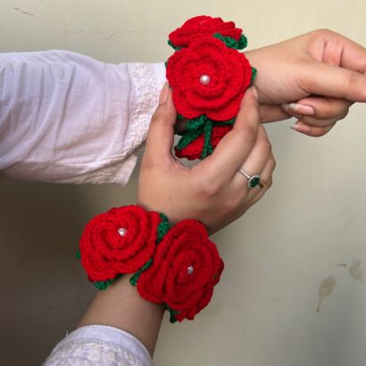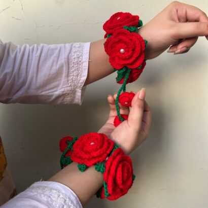 Introducing a stunning pair of handcrafted crochet floral wrist bands (hathphool/phoolon ki jewellery) that capture the romantic charm of fresh roses without the wilt! Made from soft, high-quality red wool/yarn, these bracelets feature layered roses, bright green leaves, and a delicate pearl accent at the center of each bloom.