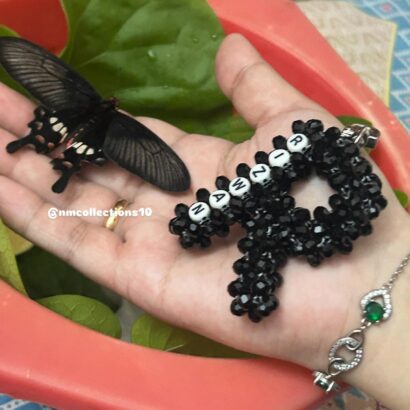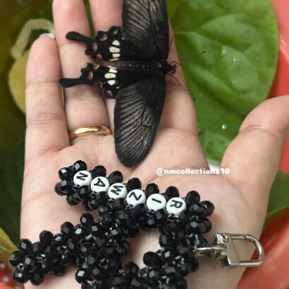 - Material: High-quality black crystal-cut beads and acrylic letter beads.