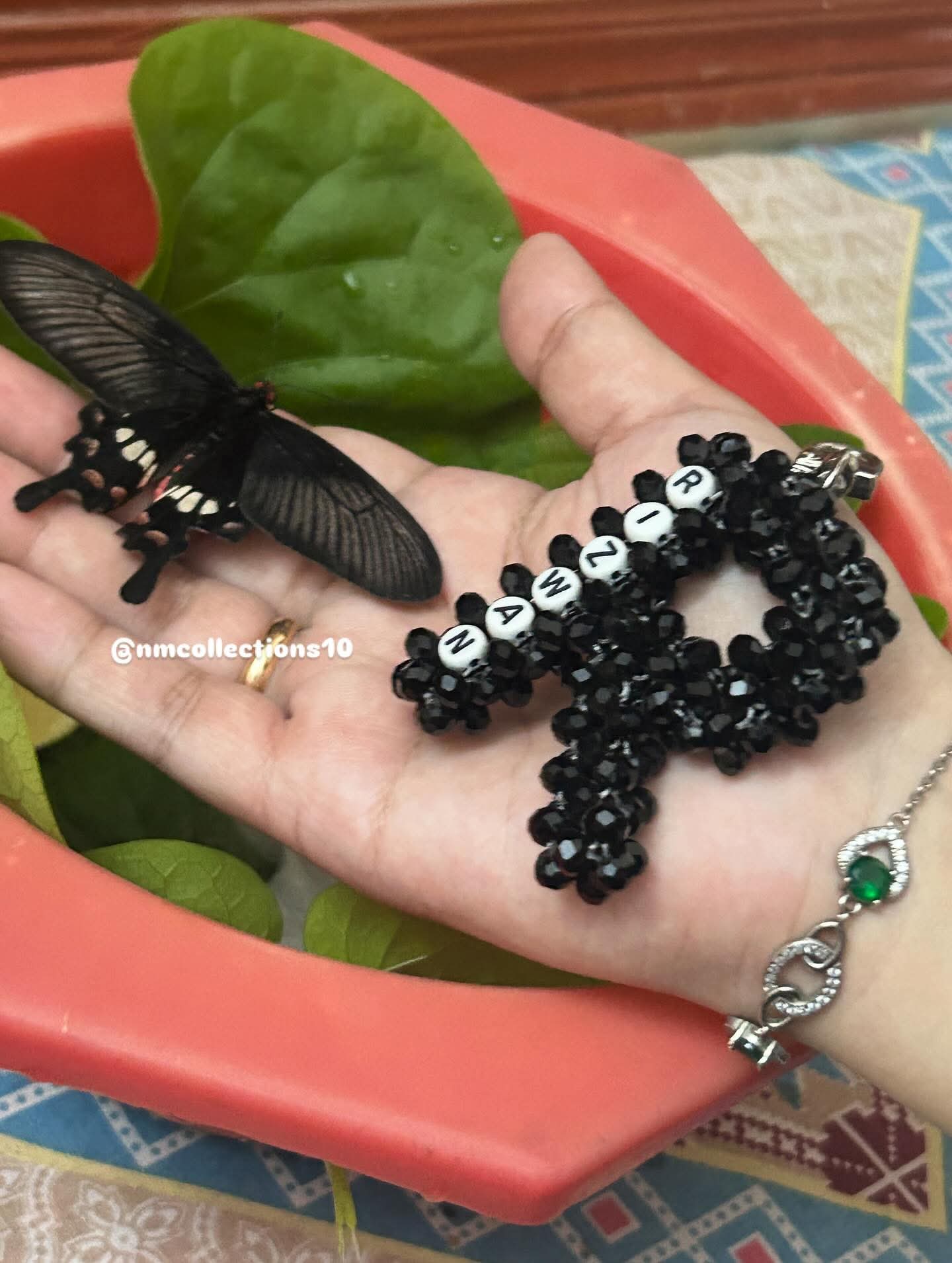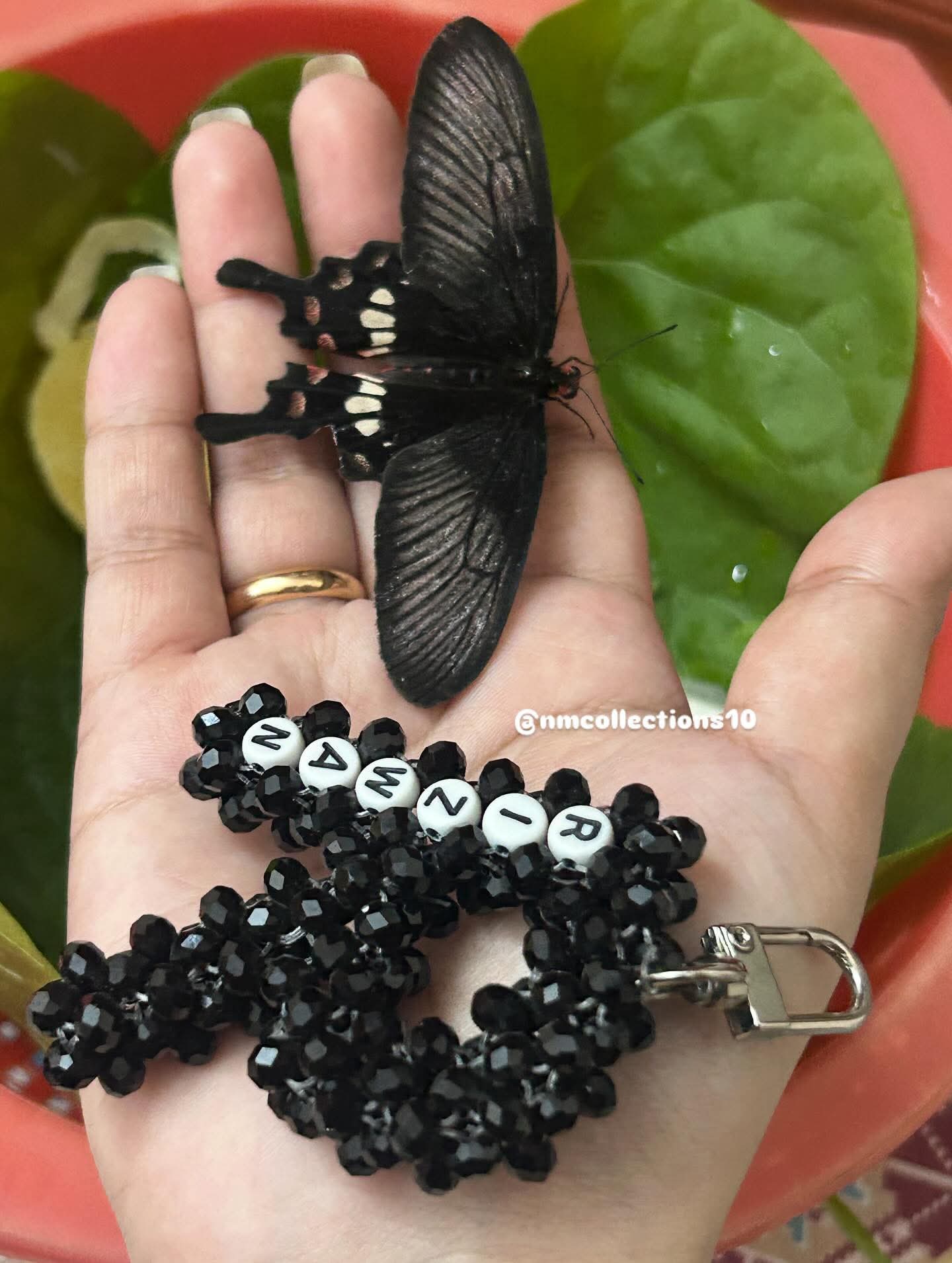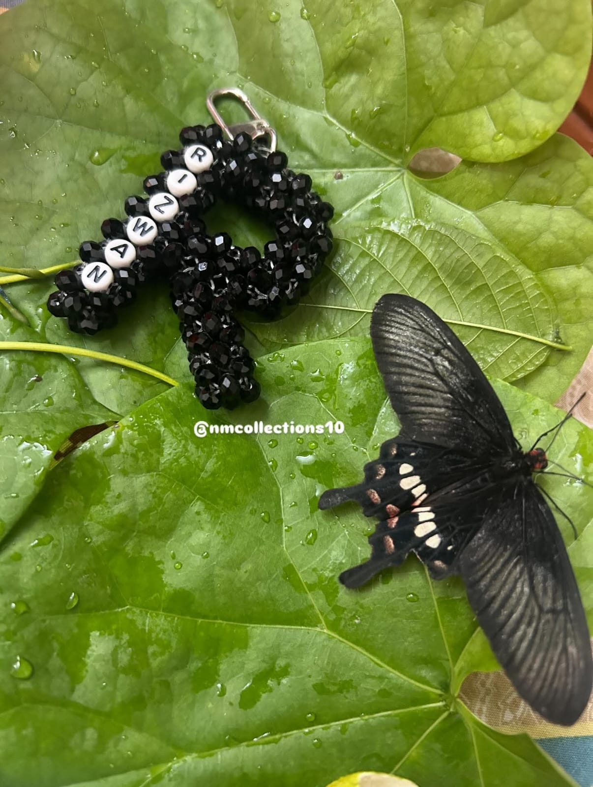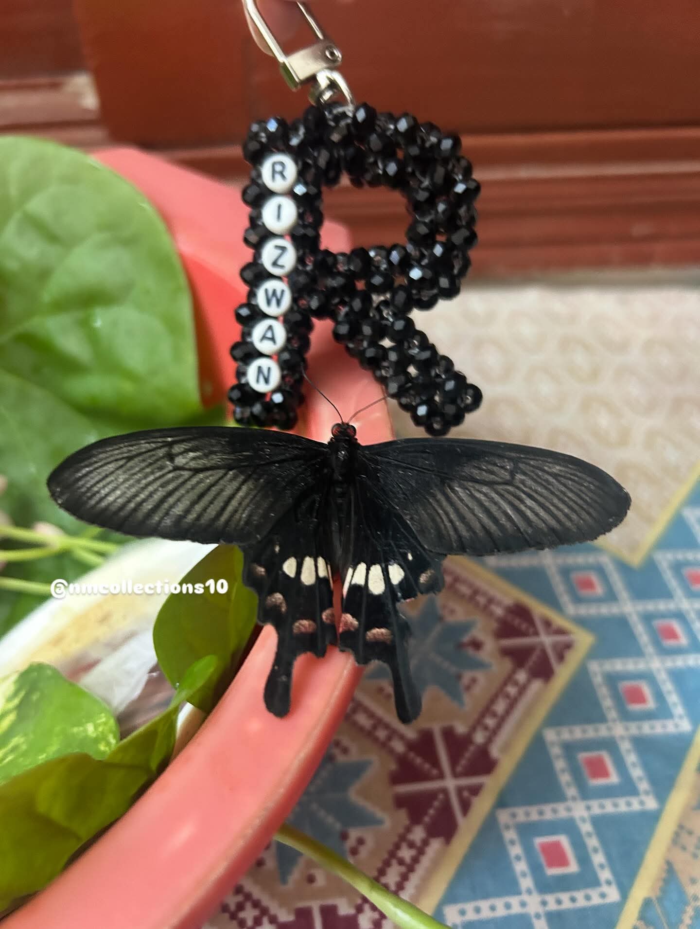 Elevate your accessories with this striking, handmade personalized name keychain. Crafted meticulously with sparkling black crystal-cut beads, this keychain is designed in the shape of the letter ‘R’ and features the name “Rizwan” spelled out in crisp white and black letter beads.